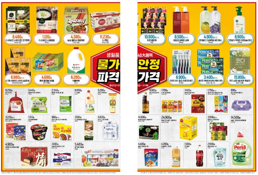 생필품 전단 행사 할인 품목 : 세제, 샴푸, 바디워시, 로션, 칫솔, 치약, 휴지, 물티슈 등