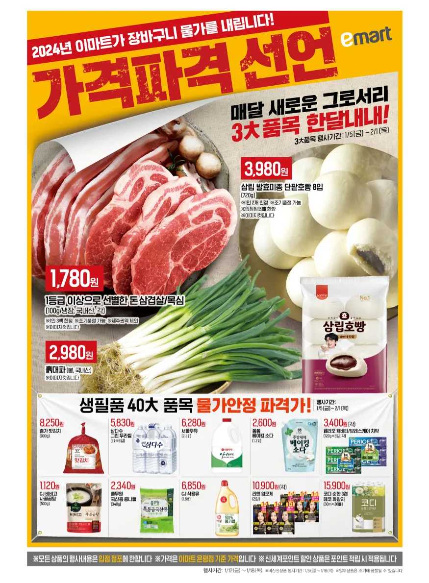2024년을 맞이하여 이마트에서 장바구니 물가를 내리고자 가격파격 선언을 했습니다. 한 달 동안 새로운 3가지 품목을 행사하며, 농림축산식품부와 해양수산부와 함께하는 전단 행사로 최대 50% 할인까지, 아시안컵 개최를 맞이하여 다양한 할인 행사도 진행하고 있습니다. 가전제품 전단 행사 할인도 진행하고 있으니, 놓치지 마시길 바랍니다.