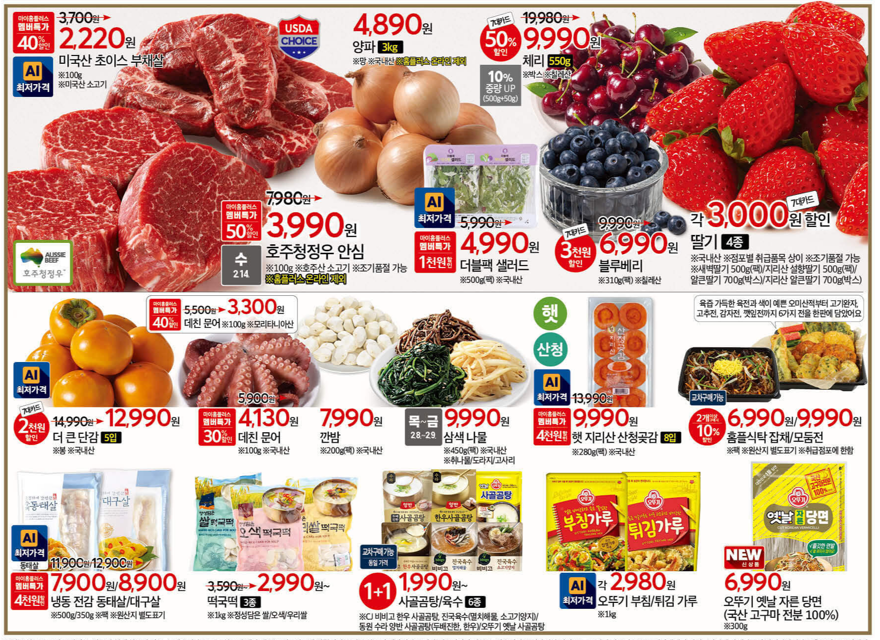 - AI 최저 가격 : 미국산 초이스 부채살, 더블팩 샐러드, 더 큰 단감 5입, 햇 지리산 산청곶감, 냉동 전감 동태살/대구살, 오뚜기 부침/튀김 가루
