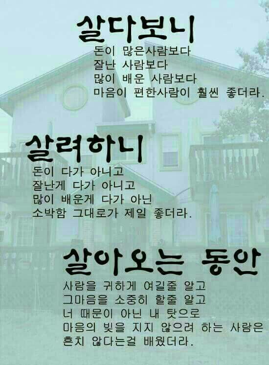- 살다 보니 돈이 많은 사람보다 잘난 사람보다 많이 배운 사람 보다 마음 편한 사람이 훨씬 좋더라. 살려하니 돈이 다가 아니고 잘난 게 다가 아니고 많이 배운 게 다가 아닌 소박함 그대로가 제일 좋더라. 살아오는 동안 사람을 귀하게 여길 줄 알고 그 마음을 소중히 할 줄 알고 너 때문이 아닌 내 탓으로 마음의 빚을 지지 않으려 하는 사람은 흔치 않다는 걸 배웠더라.