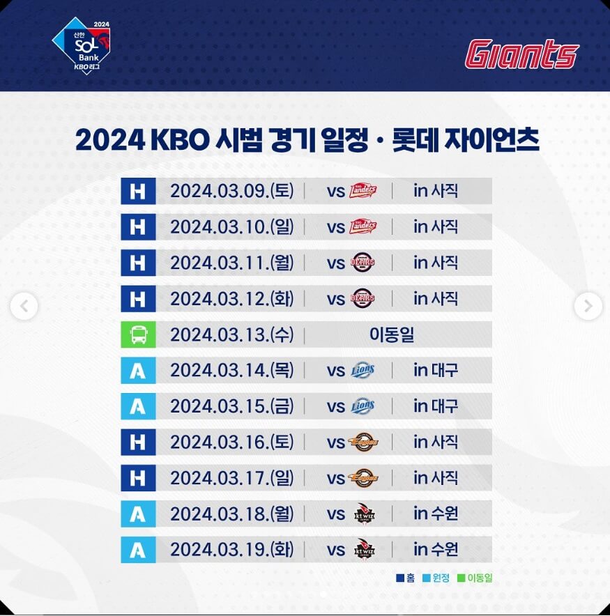 ✅ 롯데 자이언츠 : 사직 > 대구 > 사직 > 수원 (홈 6경기)
