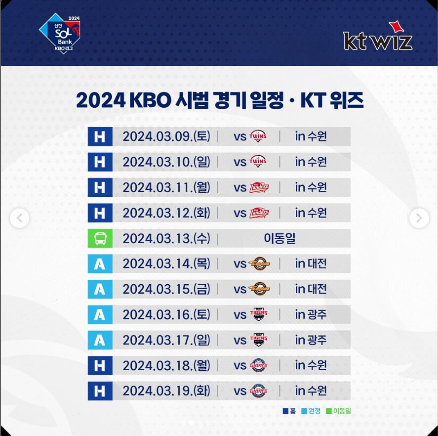 ✅ KT 위즈 : 수원 > 대전 > 광주 > 수원 (홈 6경기)