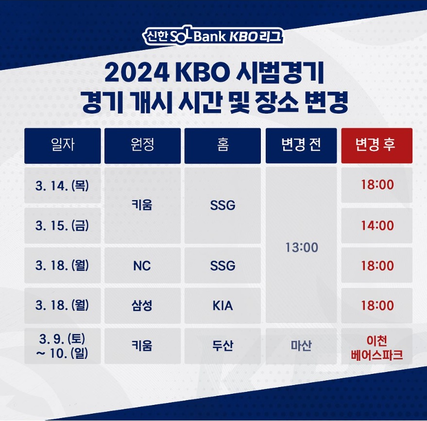 시범경기 모든 경기는 오후 1시로 일정이 발표되었으나, 중간중간 변경 된 시간도 있으니 아래에서 참고하시길 바랍니다.