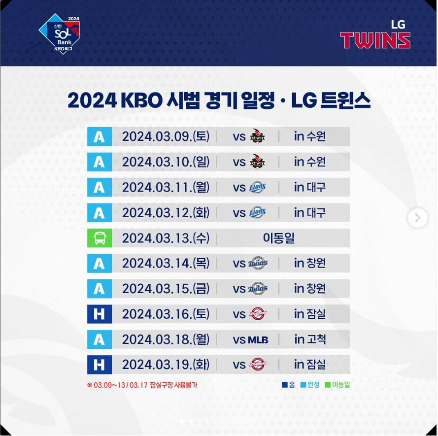 ✅ LG 트윈스 : 수원 > 대구 > 창원 > 잠실 > 고척 > 잠실 (홈 2경기)