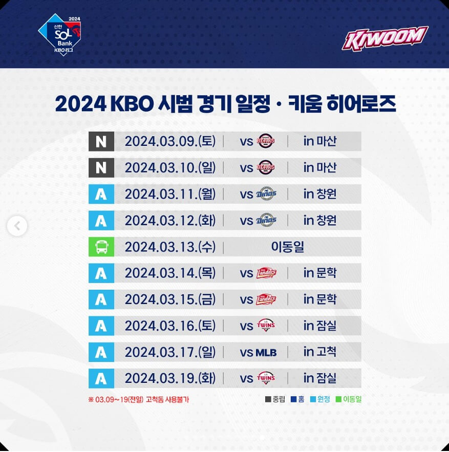 올 시즌 프로야구 시범경기는 5년만에 3월 개막을 시작으로 많은 관중들이 찾을 것으로 예상되고 있습니다. 3월 9일부터 3월 19일까지 야구 팀당 10경기씩 펼쳐지는데요. 이번에 MLB 서울 개막전 경기를 치르는 LG와 키움은 예외로 8경기를 진행할 예정입니다.