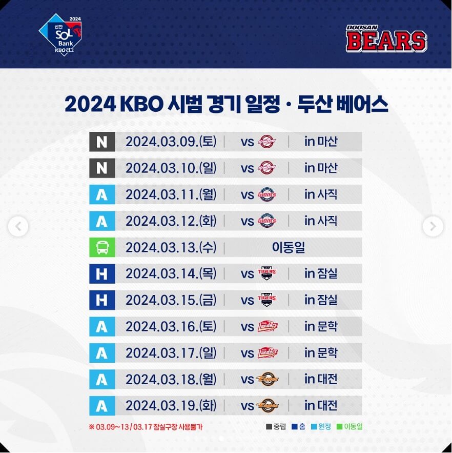 ✅ 두산 베어스 : 마산 - 이천 변경 > 사직 > 잠실 > 문학 > 대전 (홈 4경기)