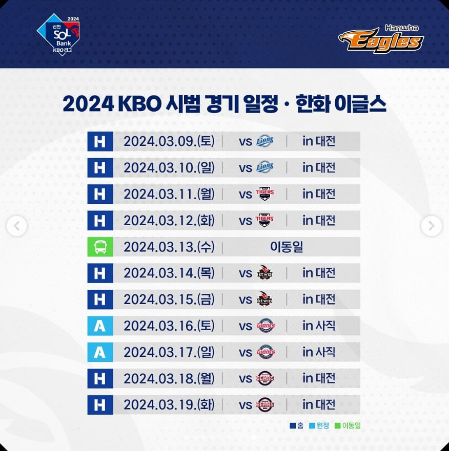 ✅ 한화 이글스 : 대전 > 사직 > 대전 (홈 8경기)